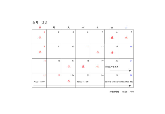 2月のカレンダーです。毎月、休みが不定休となりますのでご確認の上、ご来店ください。2月は大内正伸さんの展示「大内正伸の自...